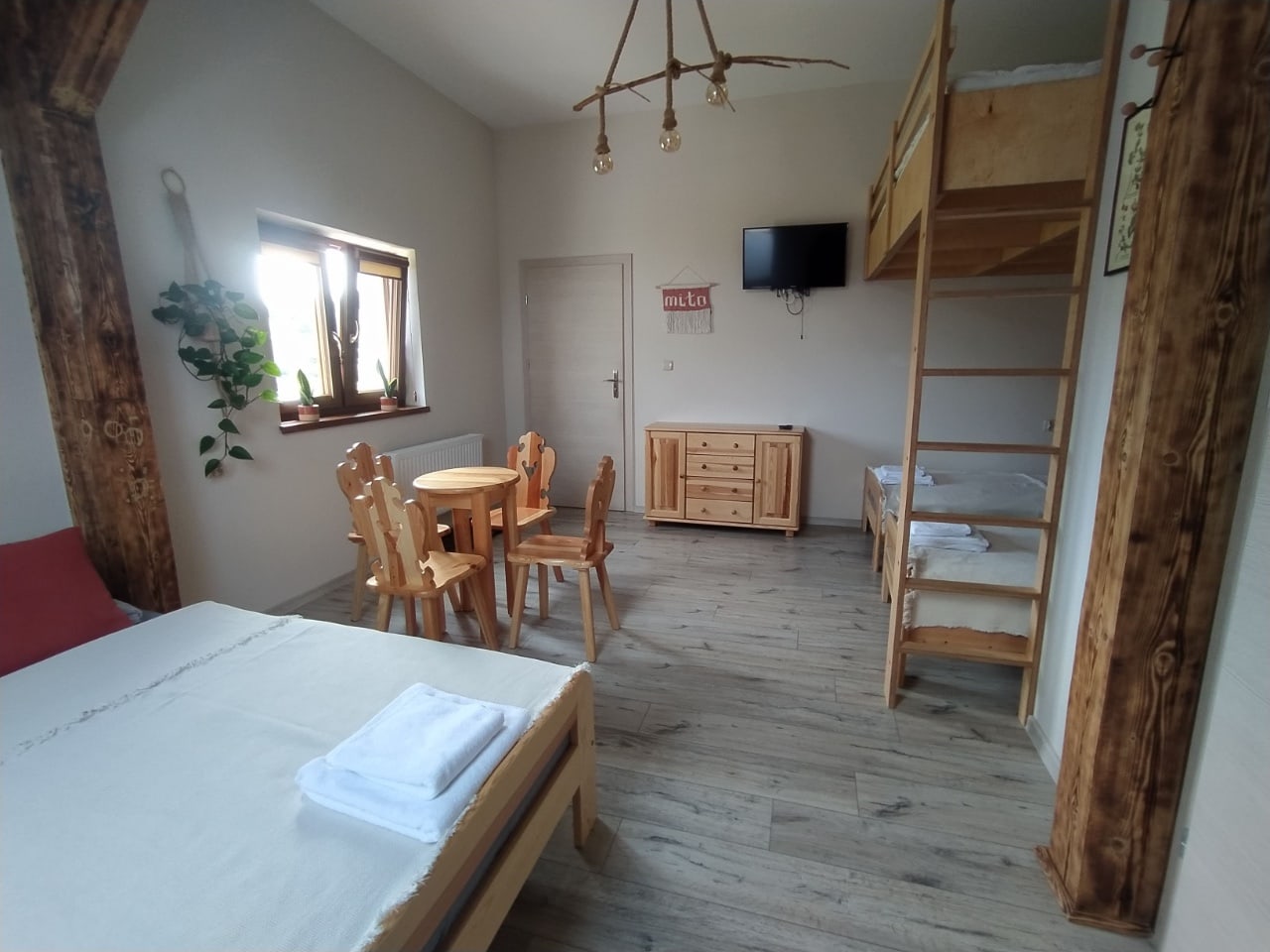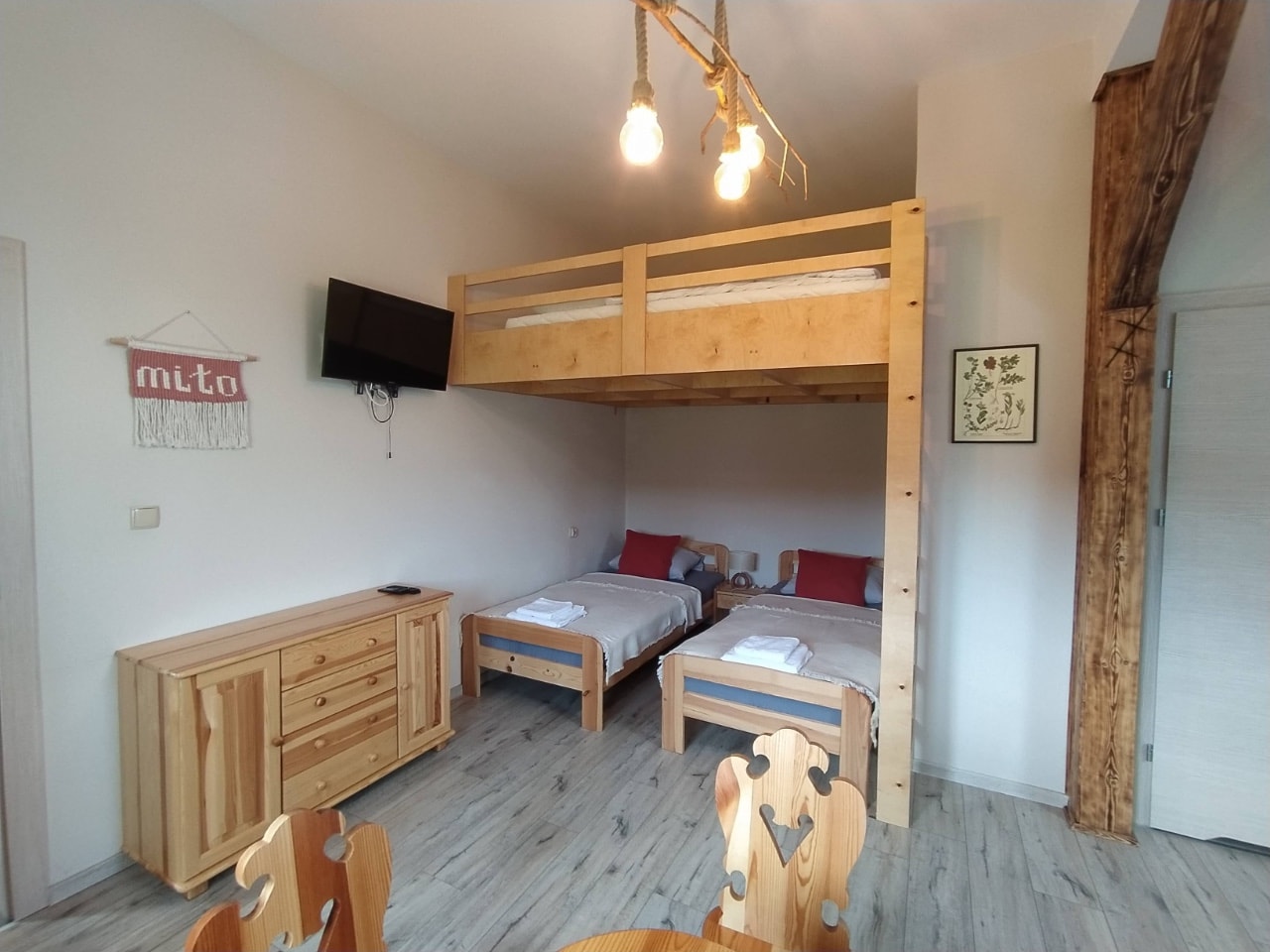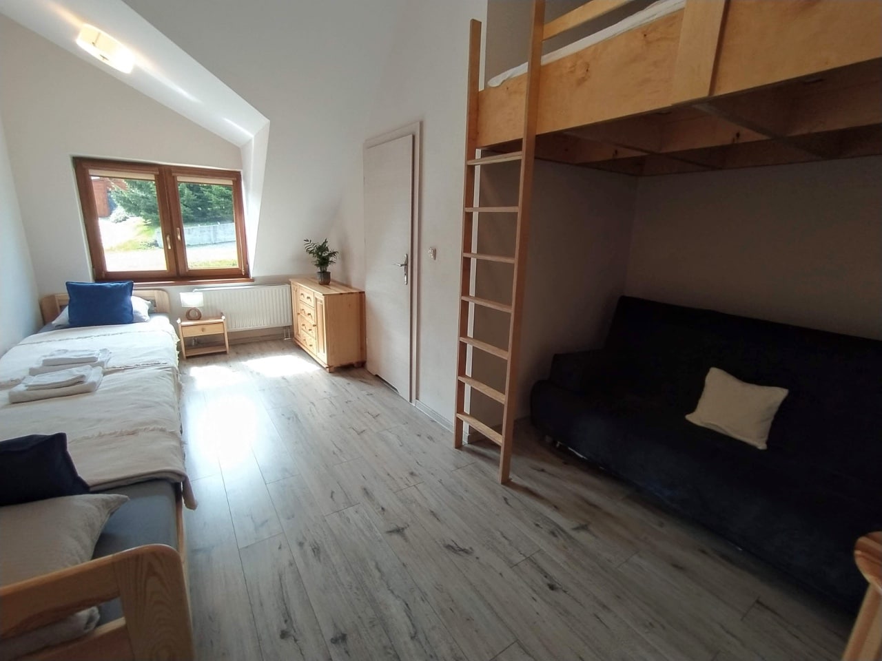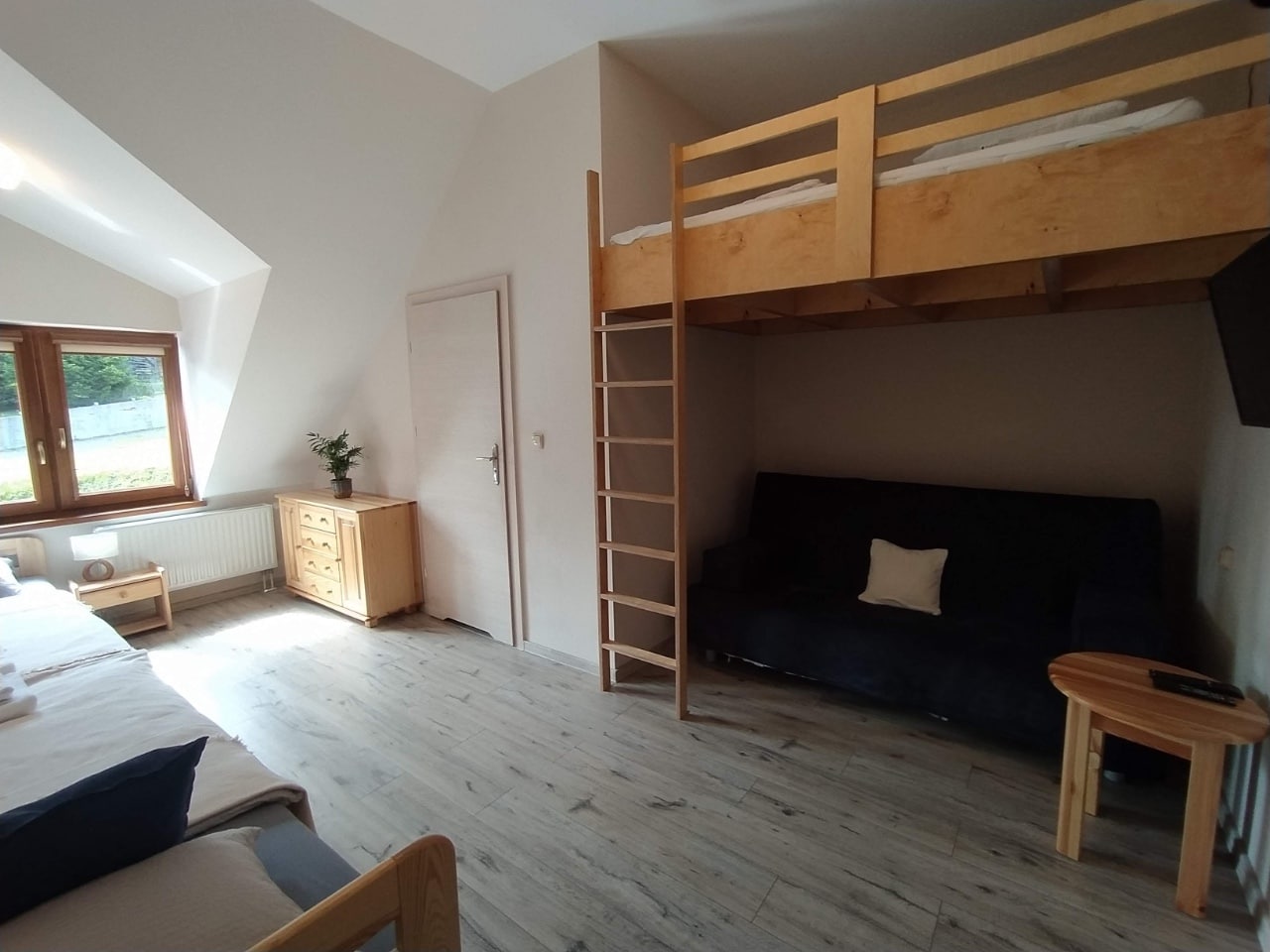 Pokój idealny dla rodziny ze starszymi dziećmi. Do dyspozycji gości przygotowaliśmy 2 łóżka pojedyncze, wygodną, rozkładaną kanapę oraz antresolę o wymiarach 160 x 200 cm.