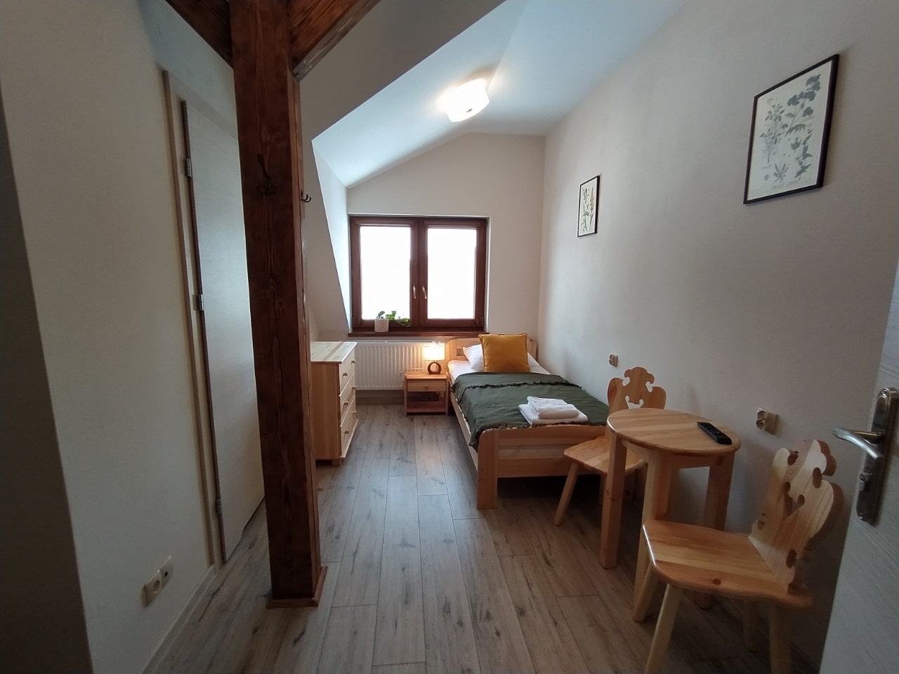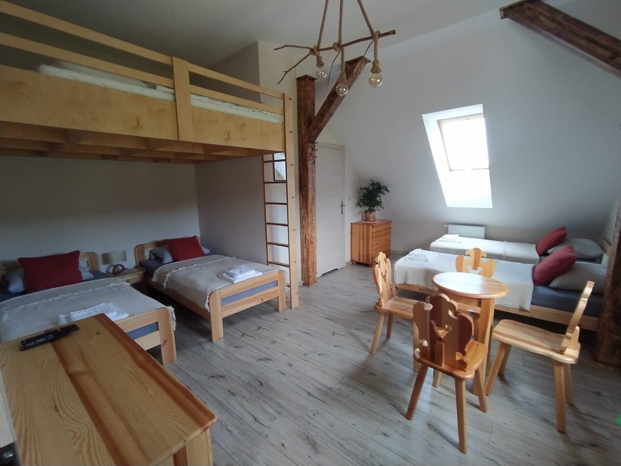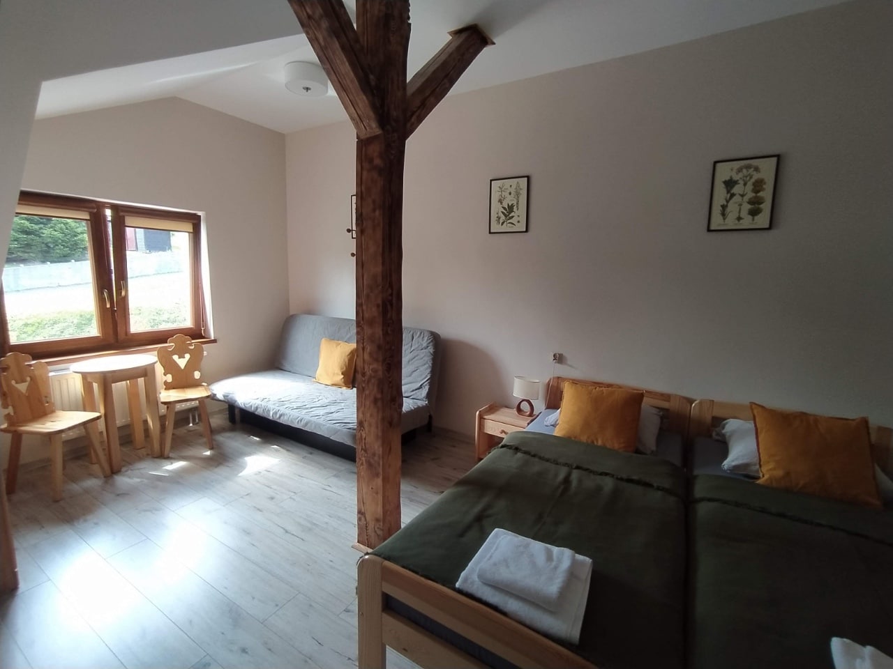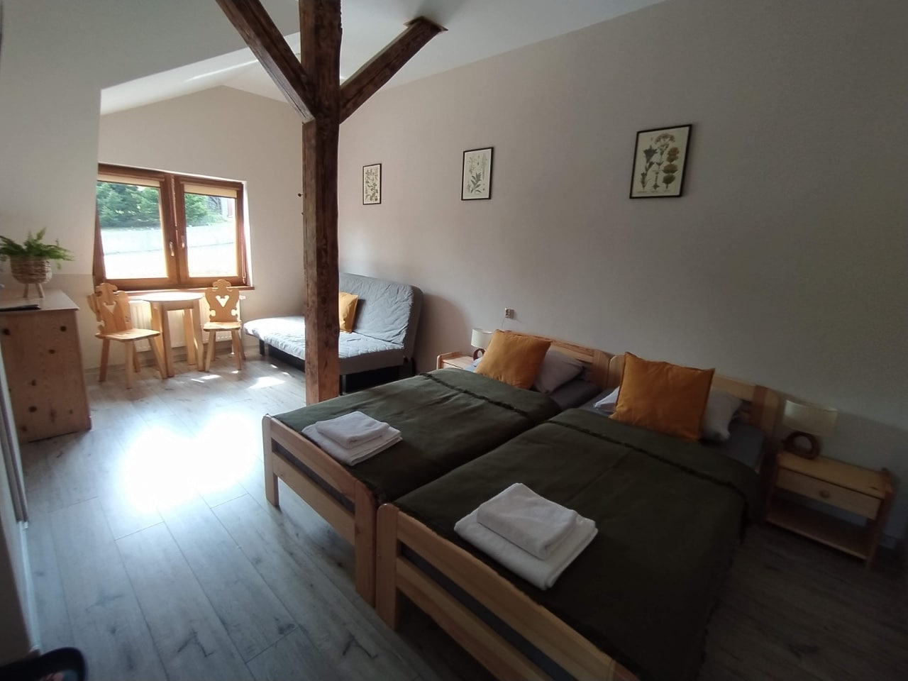 Nagietek jest największym z oferowanych przez nas pokoi. Bez problemu wyśpi się w nim duża rodzina lub grupa przyjaciół. Pokój wyposażony jest w 4 łózka pojedyncze oraz dużą 2-osobową antresolę. Z okna rozciąga się widok na łąki i lasy, na których często wypasa się dzika zwierzyna.