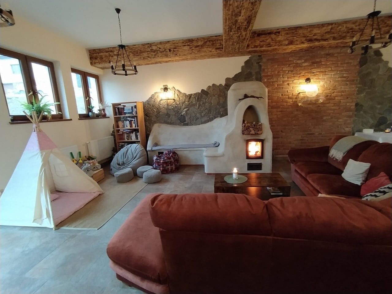 Dzieci również mają tutaj swój kącik – wyposażony w namiot tipi oraz mnóstwo drewnianych zabawek.
